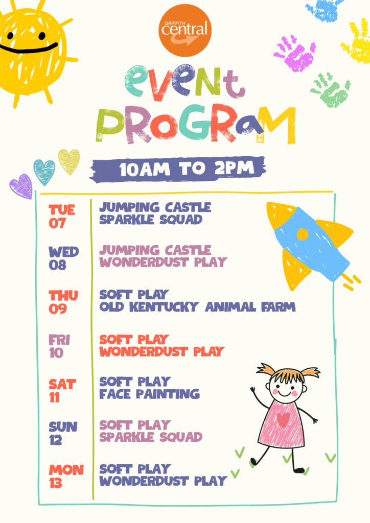 These April school holidays, Griffith Central is turning up the fun — and it’s all completely FREE. From Tuesday 7 April to Sunday 19 April, kids can dive into a world of creativity and excitement with daily activities running from 10am to 2pm.